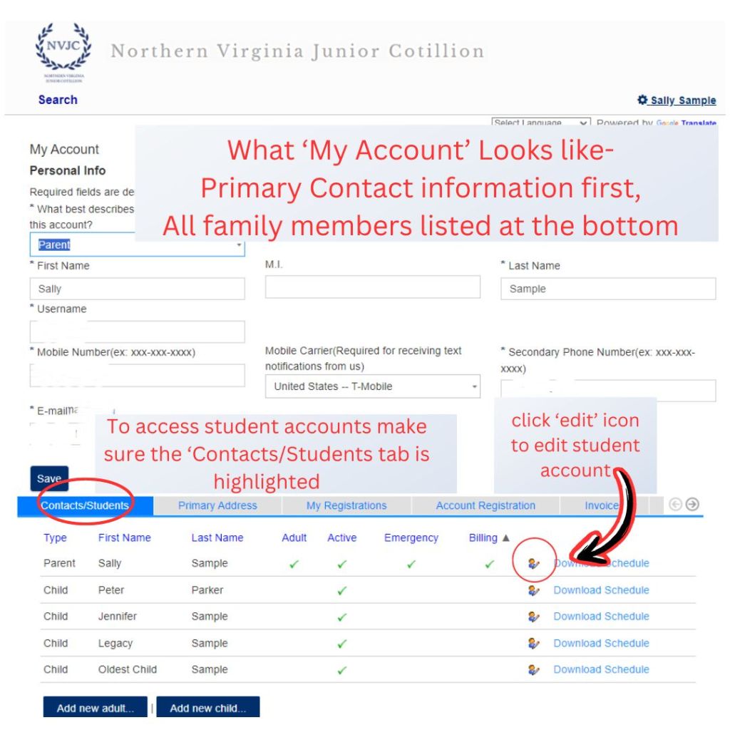 Now you can see your account. Remember it will pull up the primary adult contact information first. To see other family members, scroll down.